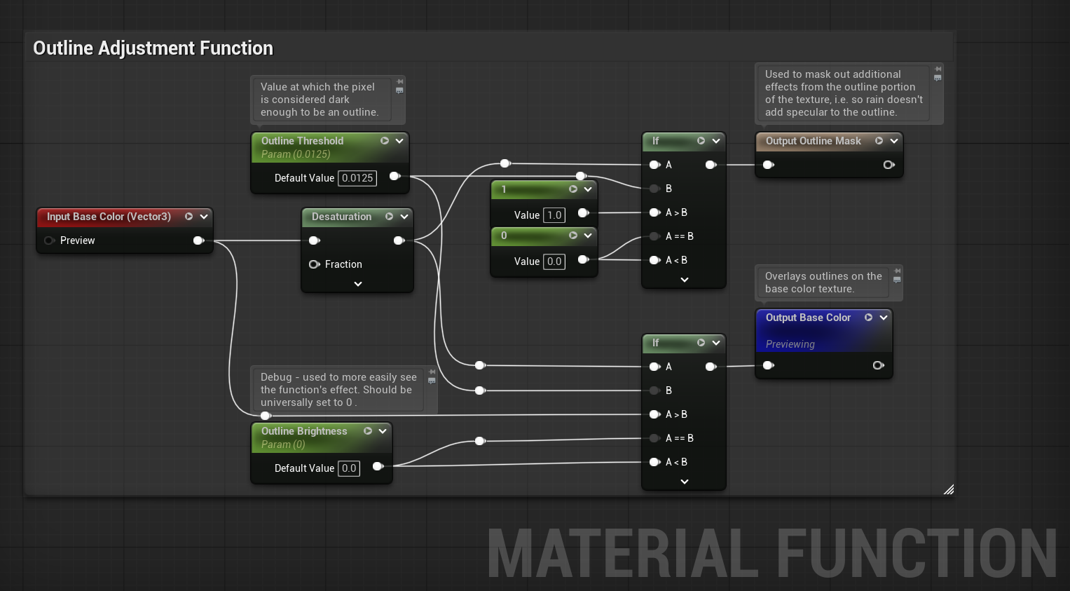 The in-texture solution looked great, but was slow to iterate, so I created this material function so my artists and I could quickly adjust the intensity of the outline effect.