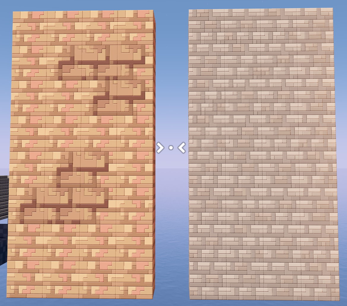 An example of a direction we decided on for our brickwork. On the left, the old bricks used heavy contrast in the linework, but the new direction opted for lower contrast and more realistic colours.